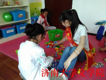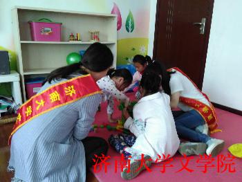 志愿者来到目的地之后,四个三年级的学生接着就来到这里,志愿者和小学生亲切的打招呼问候。陆续的又有两个小学生来到这儿。志愿者们和小学生一起玩堆积木,拍皮球,玩得不亦乐乎。有个带着白框眼镜的女孩问志愿者:“女娲是谁生的?”志愿者告诉她,这个人物可能是虚构的。她开始不停地问“为什么?”志愿者就不耐其烦的一点点的给她解释。有三个男孩子围坐在一起玩“三国杀”的纸牌游戏,志愿者旁敲侧击的给他们讲《三国》里的故事。寓教于乐,这不失为一种有效的学习方式。